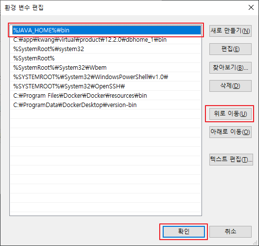 여기서 끝이 아니라 이제 입력한 이 값을 [위로 이동] 버튼을 눌러 제일 위로 옮겨주고 [확인] 버튼을 클릭합니다.