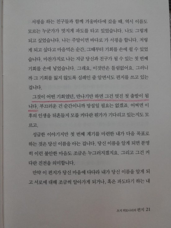 책 이름이 마음에 들어 끌려서 읽게 된 책이었다. 당시 일본 영화나 책에도 관심이 많았던 시기이기도 했다. 지금은 자주 쓰지 않지만 과거 편지 쓰는 것을 종종 즐기고는 했다. 그때는 지금처럼 "ㅋㅋ", "ㅎㅎ" 또는 이모티콘 같은 것들을 쓰지 않았던 시절이었고 그런 게 없어도 전혀 이상하지 않던 시절이었다. 그런 것들이 없어도 온전히 글 만으로도 그 사람의 마음이 잘 느껴지던 그런 순수함(?) 같은 것들이 있던 시절이었다.