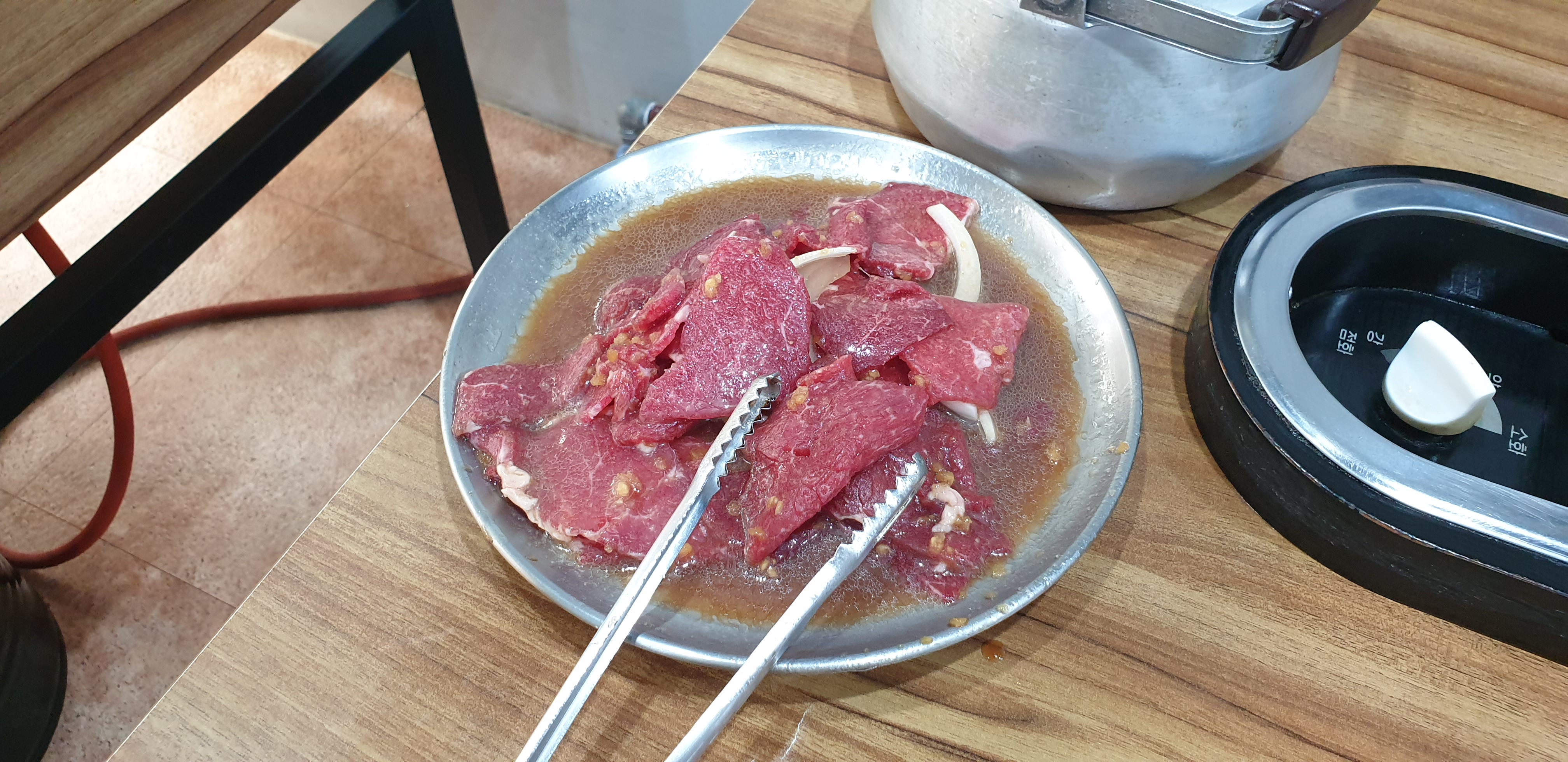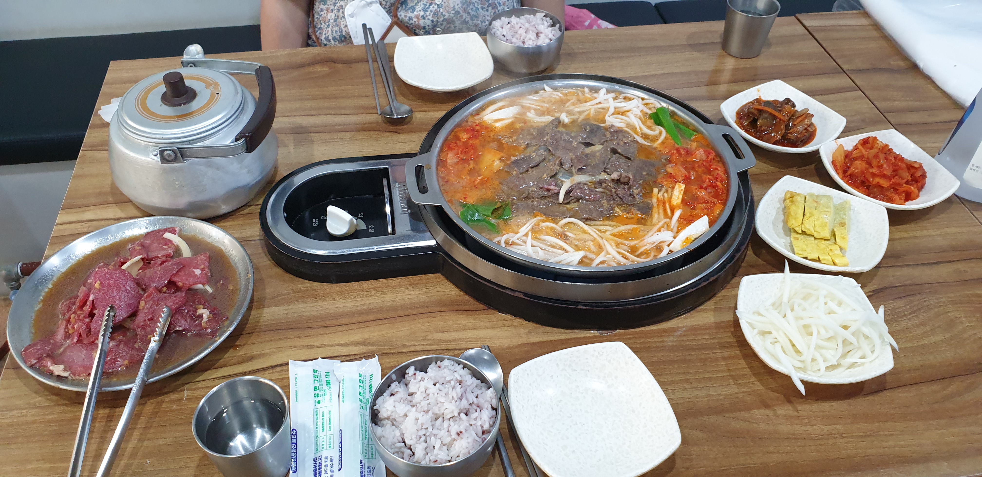 예전처럼 김치 불고기를 주문했다. 다른 메뉴는 또 뭐가 있었는지 기억이 잘 나지 않는다. 그냥 여기 오면 이거 시키는거다. 주문하면 사진 처럼 저렇게 생긴 불고기용 불판에 김치와 파와 버섯과 무생채를 넣고 육수를 부어 기본 셋팅을 해주신다. 시원한 국물의 비법은 김치도 있겠지만 바로 저 무생채가 아닌가 싶다. 저 무생채가 맛의 비법 같다. 기본 셋팅 외에 김치와 무생채를 더 주시는데 먹으면서 김치와 무생채를 더 넣고 육수를 더 넣으면서 계속 만들어 먹을 수 있다. 무생채는 아끼지 말고 다 넣도록 하자.