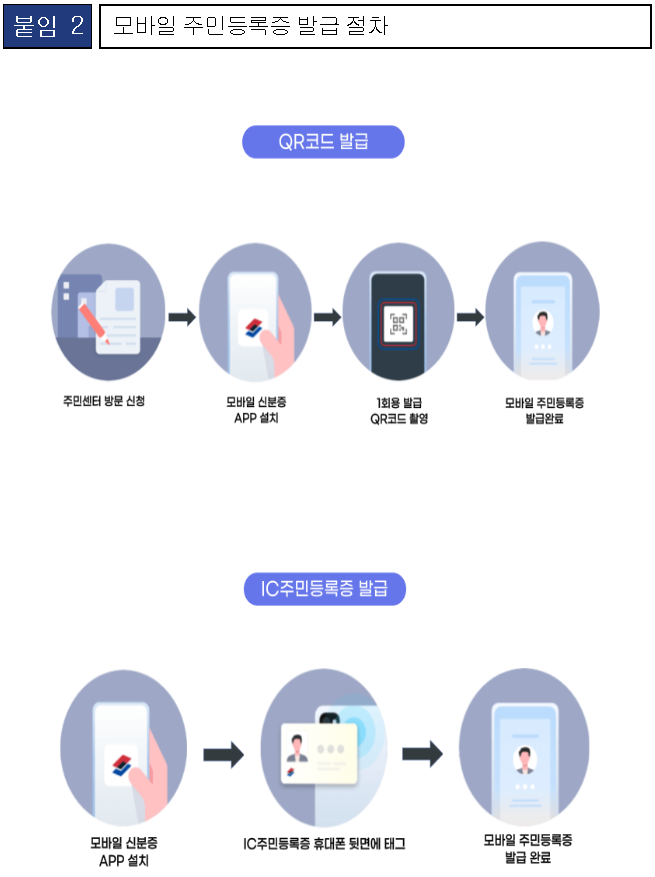 - 주민센터 방문 발급읍·면·동 주민센터에서 발급용 QR코드를 스캔하여 모바일 주민등록증 즉시 발급. 단, 휴대전화 변경 시 주민센터 방문 재발급 필요.