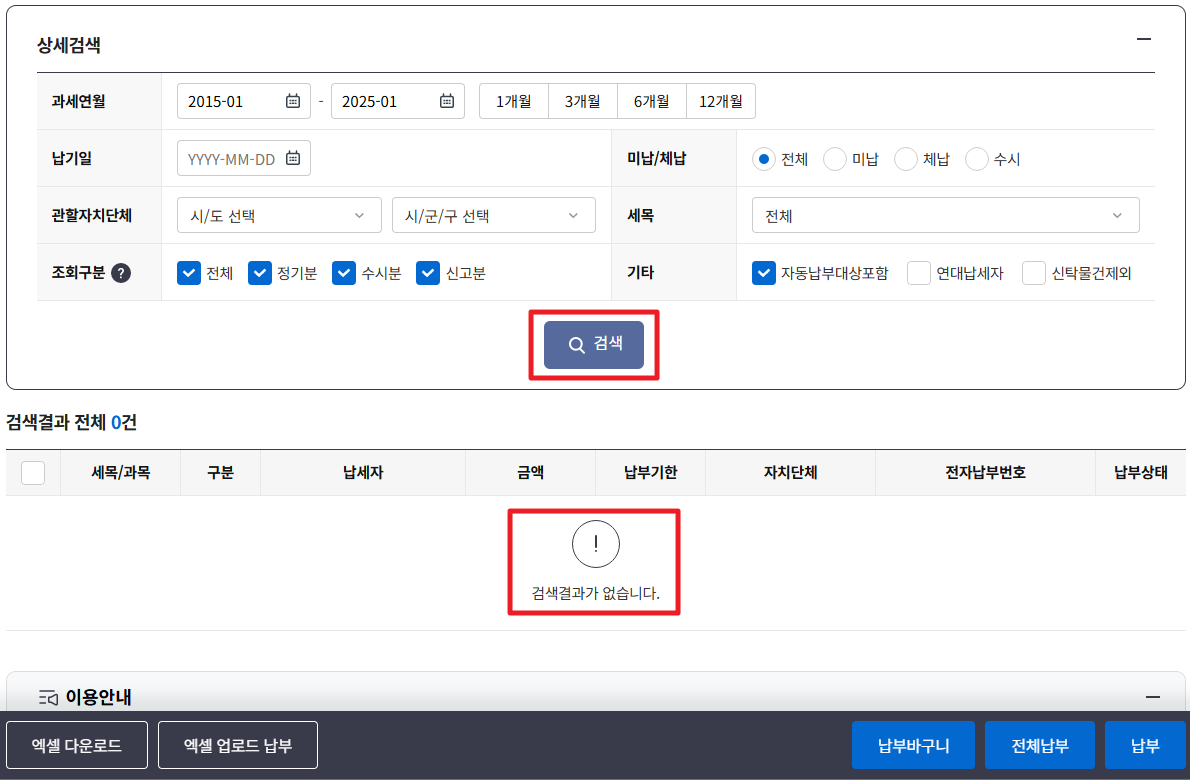납부 완료 후 지방세 화면에서 다시 검색 버튼을 클릭하여 조회해보면 검색결과 목록에서 납부해야 할 지방세가 모두 사라진 것을 확인 할 수 있습니다.