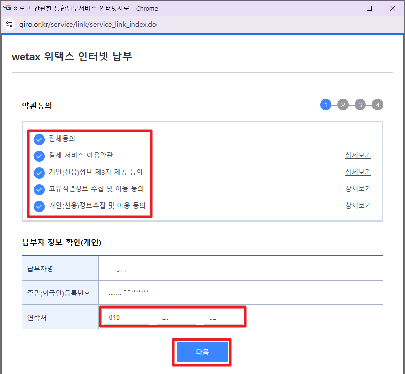 약관을 전체동의 하고 연락처를 입력 후 다음 버튼을 클릭합니다.