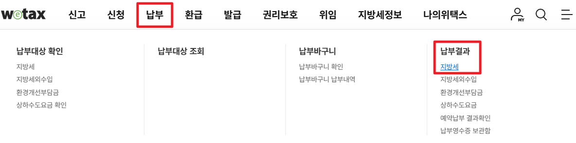 납부결과를 더 정확히 확인하고 싶으면 납부결과 화면으로 가서 조회를 해보시면 됩니다. 위택스 상단 메뉴에서 납부 > 납부결과 > 지방세 메뉴를 클릭합니다.