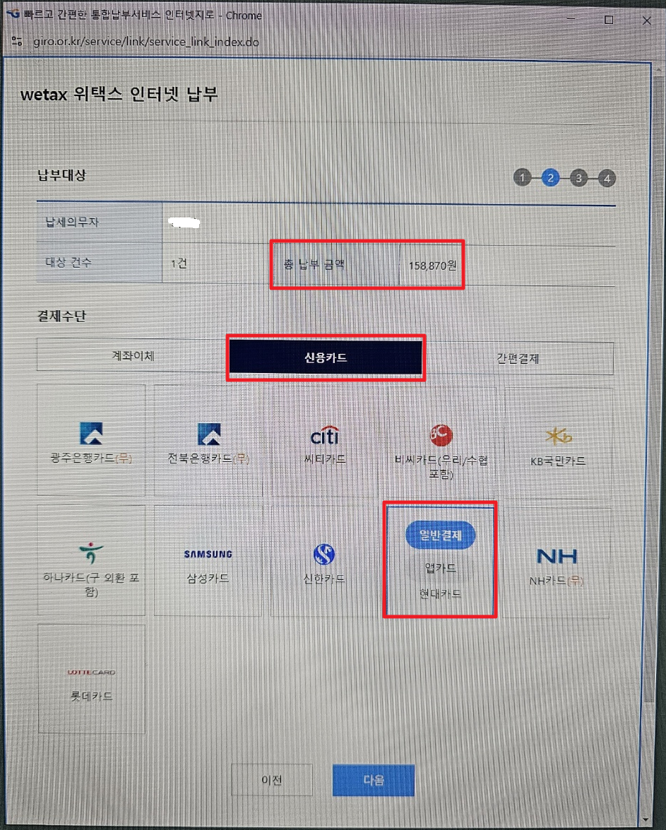 총 납부 금액이 맞는지 확인하고 결제수단을 선택하고 다음 버튼을 클릭합니다.