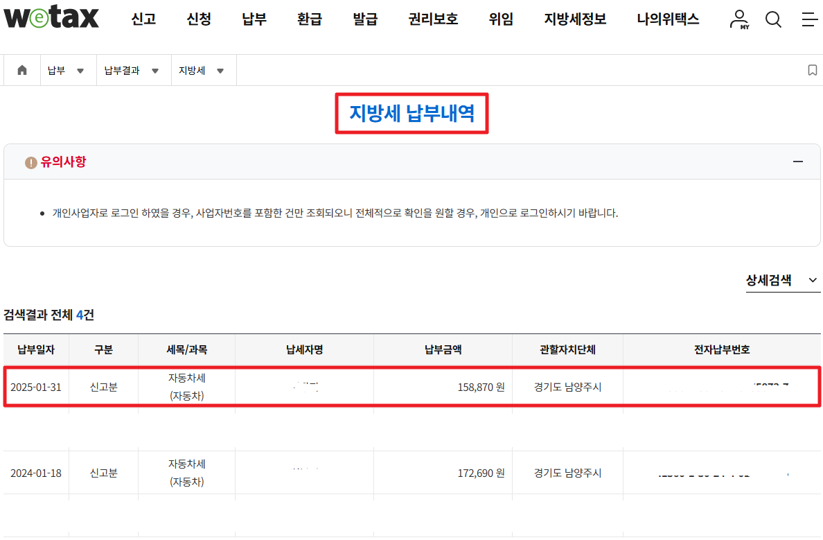 지방세 납부내역 화면에 보이는 것과 같이 방금 납부한 자동차세 납부내역이 목록에 보여지는 것을 확인할 수 있습니다.