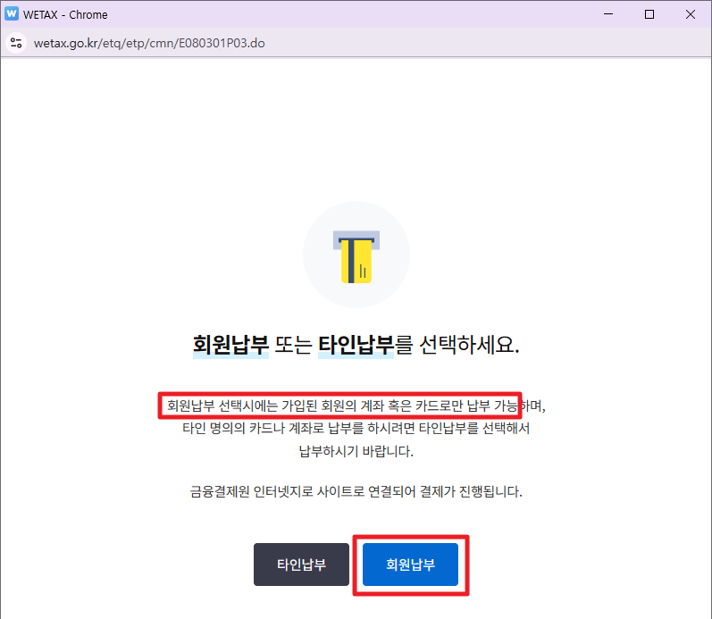 그럼 아래와 같은 팝업 화면이 보여지게 됩니다. 본인이 직접 본인 계좌나 카드로 납부하는 경우에는 회원납부를 선택하시고, 타인의 명의 카드나 계좌로 납부를 하시는 경우 타인납부를 클릭하시면 됩니다. 저는 제가 직접 제 카드로 납부를 할 것이기 때문에 회원납부 버튼을 클릭하였습니다.
