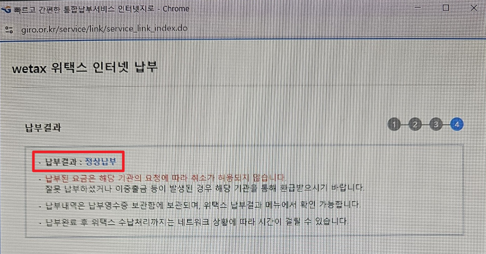 납부가 완료되면 아래와 같이 납부결과가 화면에 보여집니다. 납부결과가 정상납부로 되어있으면 정상적으로 자동차세가 납부 된 것입니다.