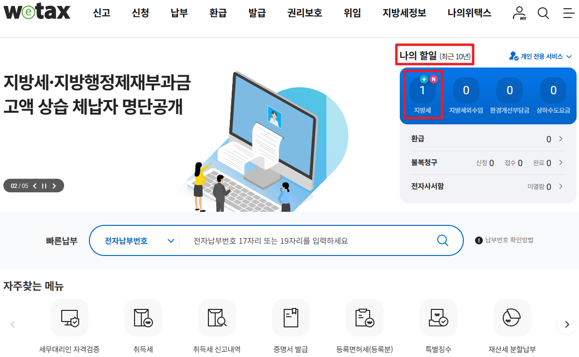 로그인이 완료되면 이렇게 위택스 메인 화면이 나오게 됩니다. 화면에서 우측 파란색 나의 할일 영역에서 지방세를 클릭합니다.
