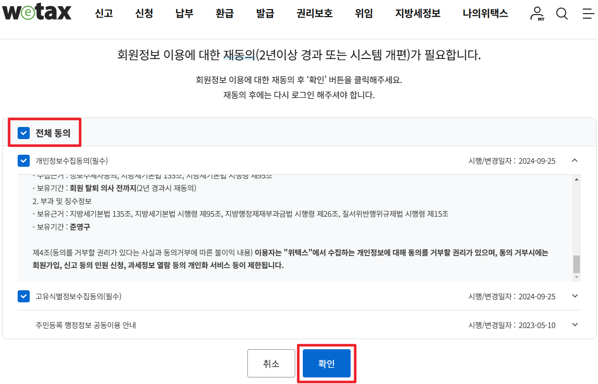 내용은 별거 없었습니다. 전체 동의 클릭하고 확인 버튼을 클릭합니다.