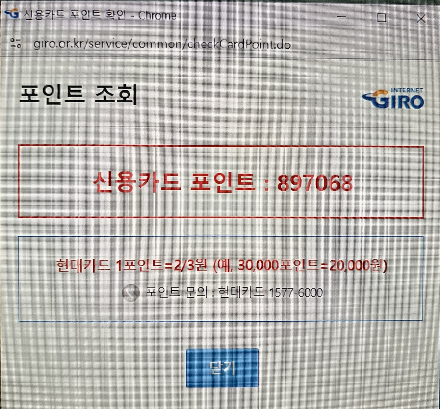 그럼 아래와 같이 신용카드 정보를 입력하는 화면이 나옵니다. 카드번호와 카드비밀번호 앞 2주리, 유효기간 월/년을 입력합니다. 저는 현대카드의 M포인트를 사용해서 납부를 할 것이기 때문에 포인트 사용여부에서 사용을 선택했습니다. 현재 내가 사용하려는 신용카드의 M포인트가 얼마나 있는지 조회해보려면 파란색 조회 버튼을 클릭합니다.