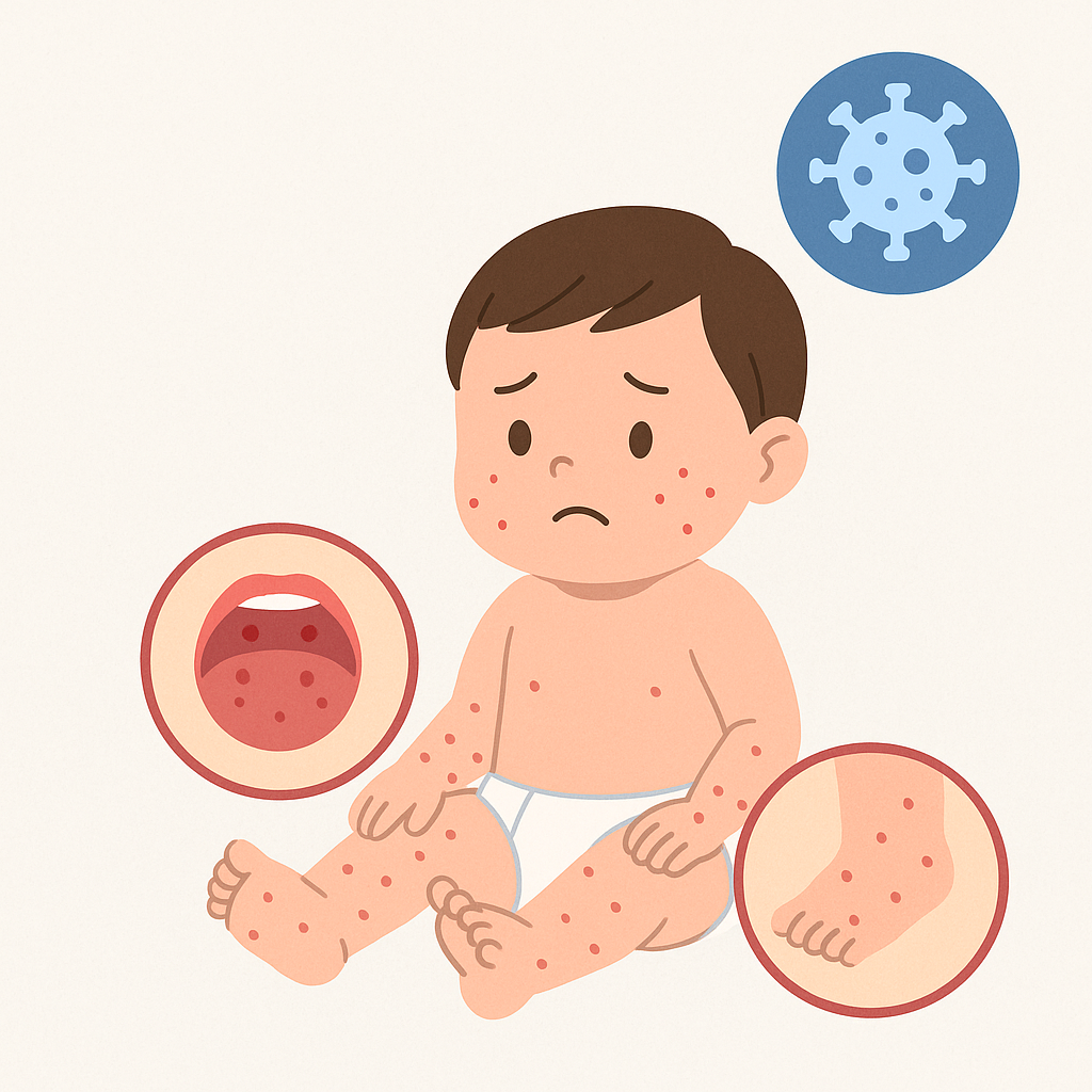 수족구병은 주로 4세 이하 영유아에게 흔히 발생하는 바이러스성 질환입니다. 주된 원인은 콕사키바이러스 A16, 엔테로바이러스 71 등 장바이러스 계열의 바이러스입니다. 이름 그대로 손, 발, 입안에 통증성 수포와 궤양이 생기는 것이 특징입니다. 보통 여름과 초가을에 유행하는데, 한 번 앓고 나서도 다른 바이러스 유형에 의해 재감염될 수 있습니다. 수족구는 감기처럼 일상에서 쉽게 접할 수 있는 질환이지만, 증상에 따라 아이와 가족 모두에게 큰 고통을 줄 수 있습니다.